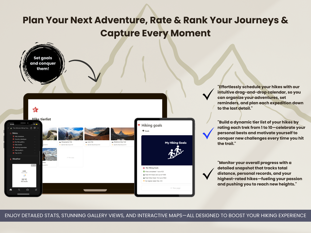 - All-in-One Organization: Manage your hikes, gear, and goals in one beautifully designed template.