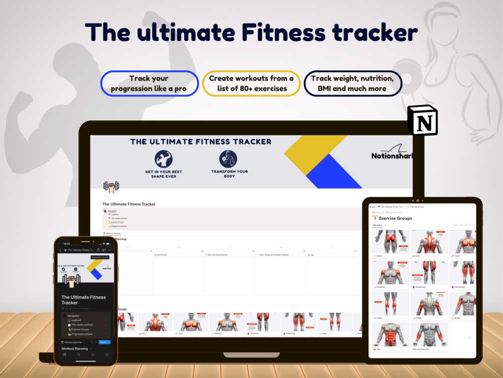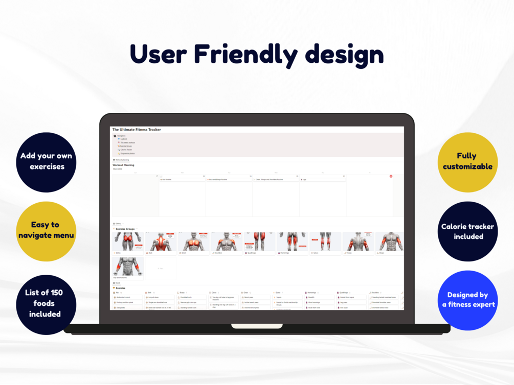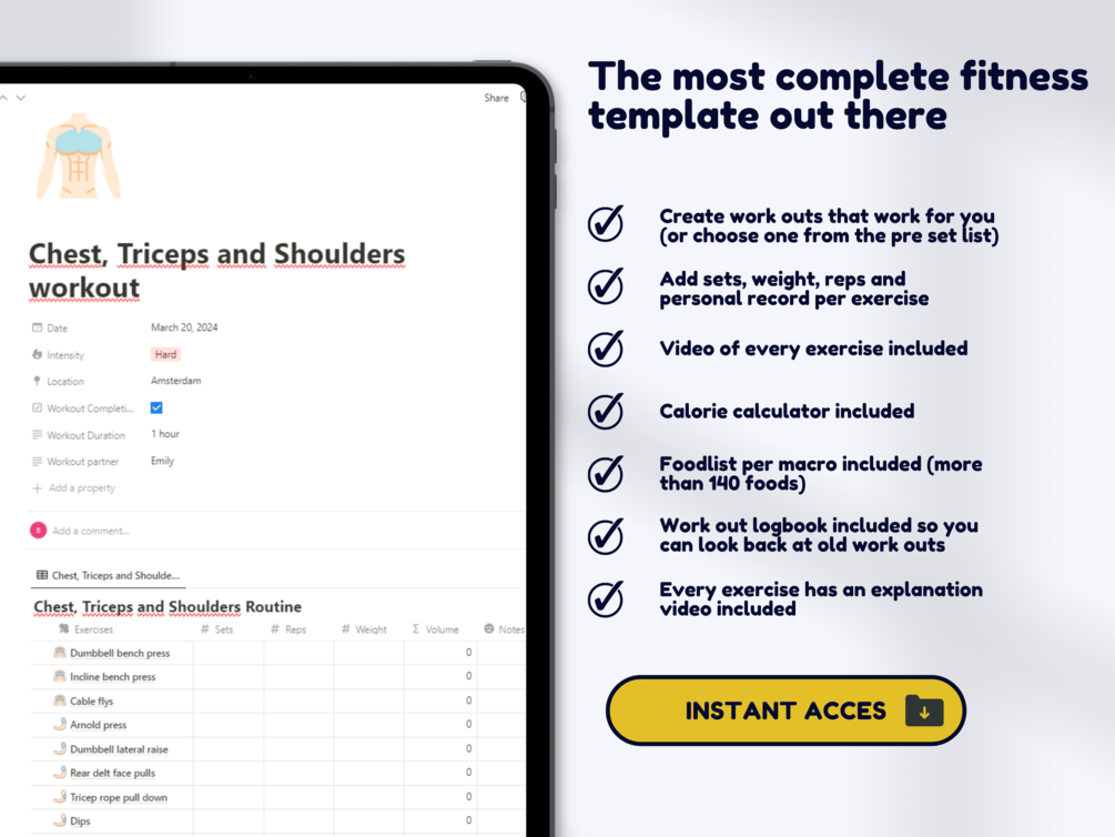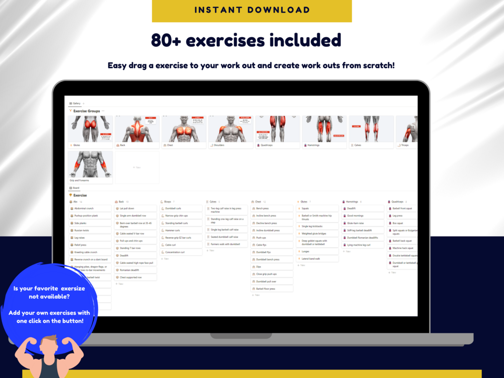 This Notion template let’s you access a diverse library of over 80 exercises, each accompanied by detailed video demonstrations to ensure proper form and technique.