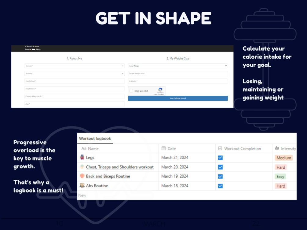 Take control of your nutrition with the calorie calculator. Easily track your daily calorie intake and expenditure to maintain a balanced diet and reach your weight goals. After you have calculated your calorie intake you can monitor your weight effortlessly with our integrated weight tracker. Set personalized goals and track your progress over time to stay motivated and on track towards achieving your ideal body composition.